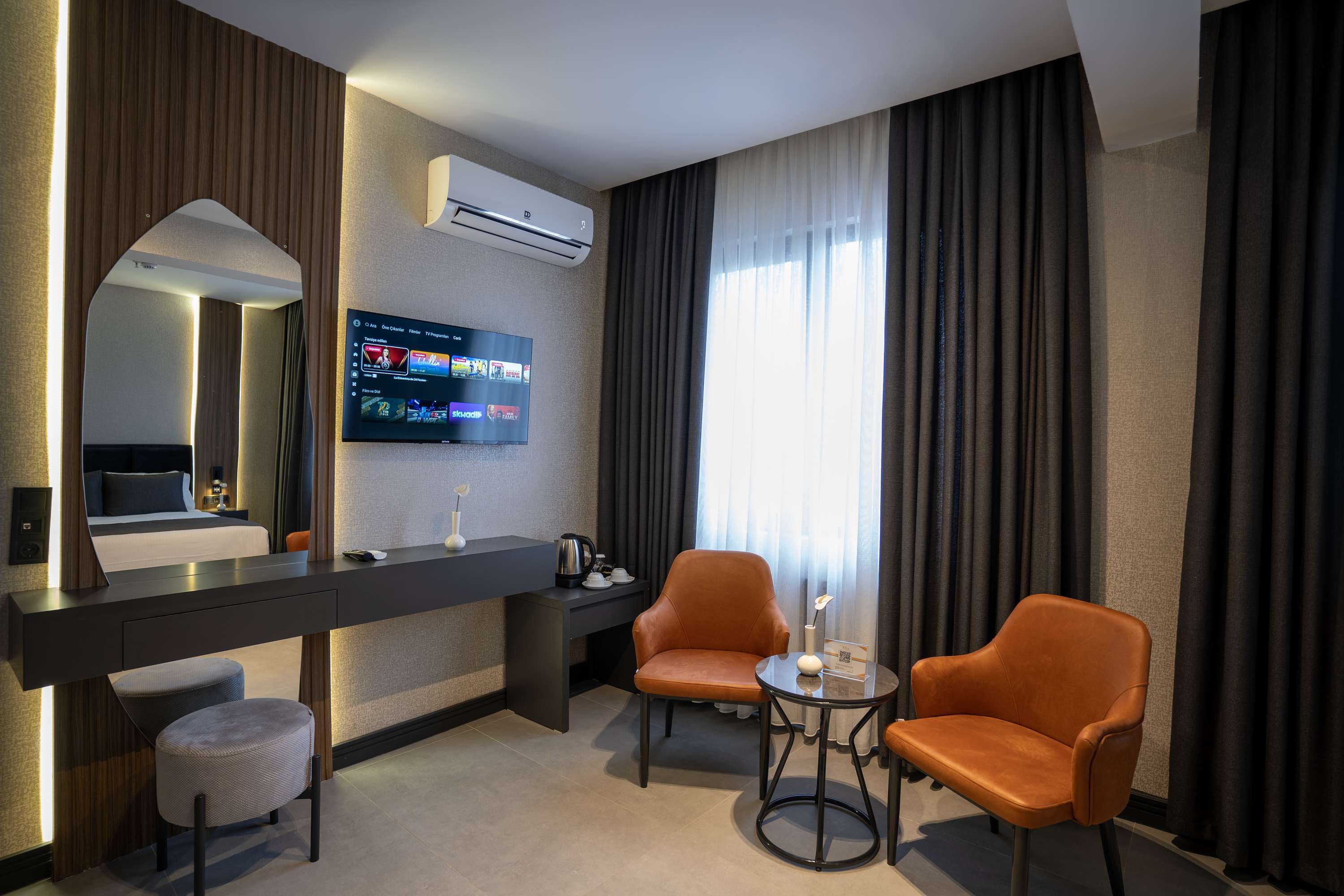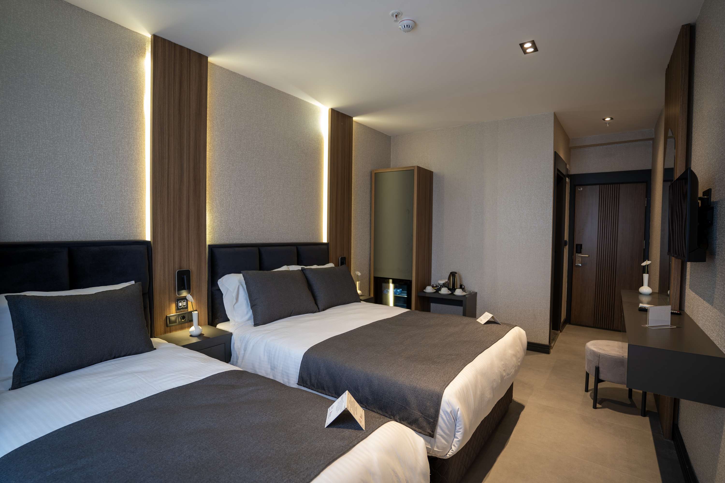 Üç kişilik yatak düzeni ile hizmet veren odalarımız, geniş yaşam alanı ve fonksiyonel tasarımıyla misafirlerimize rahat bir konaklama ortamı sunmaktadır.